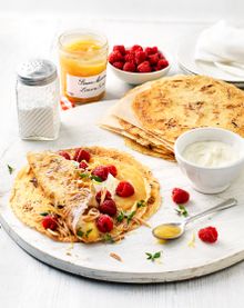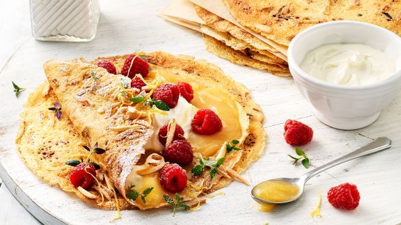 Classic French crêpes are light in texture, lacy and crisp on the edges and gorgeous all-around! Fill them with fresh raspberries and new Bonne Maman Lemon Curd for a crêpe that truly packs a zesty punch. A more colourful and satisfying alternative to the traditional lemon and sugar crêpe, this recipe is quick, easy and perfect for brunch, lunch or supper.