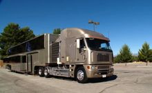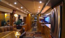 The RV also includes a conference and screening room, fully equipped, with electric blinds and 14 TV screens. The TVs are not all displayed in the open, some also pop out from unexpected places, including one embedded in a makeup mirror.
