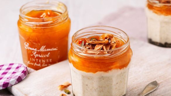 A super quick and delicious breakfast that can be made the night before in an empty jar, perfect for on-the-go. A healthy mix of chia seeds, rolled oats and almond milk topped with nuts, seeds and a generous spoonful of Apricot Intense.