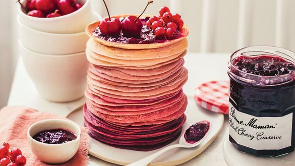Lemon and sugar? Hazelnut Chocolate Spread with bananas? Both traditional favourite combos for Pancake Day – but maybe it's time to try a whole new colour palette this year – and serve this simply gorgeous cherry showstopper from Bonne Maman. Image here.