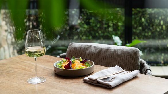 For dessert, a Basque cheesecake with Davidson plum gel offers a bright, creamy finish. Or guests can opt for Jones' signature Eleven-layer chocolate cake, served with pistachio ice cream and burnt honey collected from the resort's four on-site Flow hives.