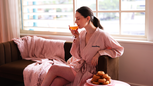 The 'Hot Cinni Suite' in room guest experience includes a cinnamon donut diffuser, cinnamon coloured luxury towels and oversized bathrobes, delicate cinnamon smelling bathroom amenities and pink deco glassware for drinks to re-hydrate after the sugar rush. And it wouldn't be five-star service without a 'Press for Hot Cinni Donuts' exclusive call service.