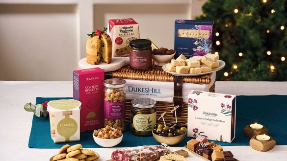 What better way to celebrate DukesHill's 40th anniversary than with the Ruby Celebration Christmas Hamper, full of DukesHill classics. This new limited edition hamper contains a Midi Boneless York Ham, Montgomery's Cheddar, Multi Seed Crackers, Sarah's Pickled Oranges, Proper Piccalilli and Venison Rillettes. There's also a Family Christmas Pudding, DukesHill's Classic Mince Pies, Handmade Scottish Shortbread, Luxury Fudge Collection, Milk Chocolate, Crunchy Biscuit & Caramelised Pecan Mendiants, Caramelised Hazelnuts, a Mini Classic Panettone and a bottle of Corney & Barrow Sparkling Blanc de Blancs Methode Traditionnelle NV. Also included is a limited edition DukesHill Canvas Tote Bag.