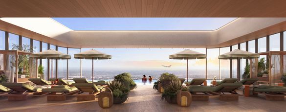 Scheduled to start construction in 2026, the 240-room hotel features an aerodynamic form with metal fins that echo aircraft panels. The curved shape will maximise views of the airfield from upper-level rooms while the rooftop pool and bar reinforce the resort feel: guests can sip a cocktail and dine 'first-class' while watching aircraft take off and land.