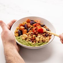 Rice and lentils with garlic spinach, roasted sweet potato and butternut squash lays a low-carb foundation, topped with spice toasted cashews and a chickpea smash. At 409kcal, it's packed with 19g of protein, 50% of your daily allowance of iron and vitamin C, and 3 of your 5 a day.