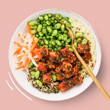 Japanese-inspired tamari and chilli glazed tofu, with edamame and lime smash, a daikon, carrot and cabbage slaw with mirin dressing, over a bulgur wheat and quinoa grain mix. What's more, at 505kcal, the grain bowl has 23 grams of protein; 11 grams of fibre, and a source of iron.