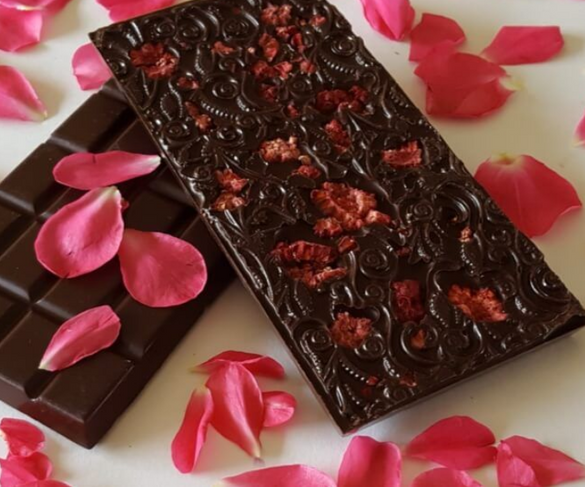 - Hazelnuts and chocolate are the perfect pairing and a superb gift to almost anyone. These hand-crafted dark chocolate hearts are made with 70% Ecuadorian cocoa. The rich, smooth velvety chocolate is studded with delicious hazelnut crumble and a touch of organic Persian rose oil.